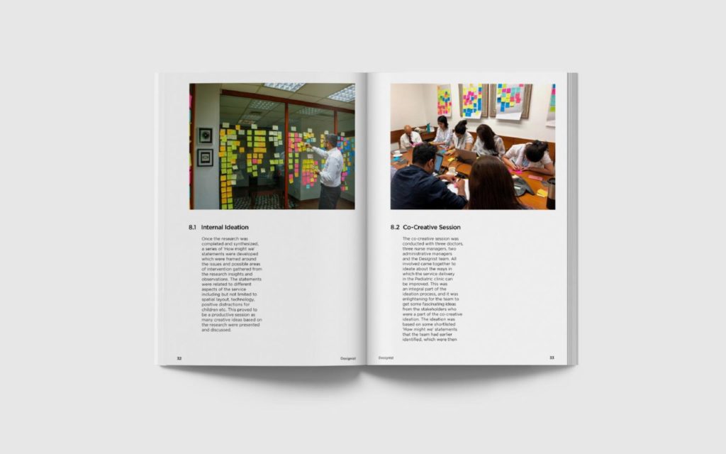 Keeping in mind the feedback from all the users, ideation sessions were conducted in house at Designist and a co-creative session was also administered at the hospital with doctors, coordinators, managers and nurses. Once the ideation was completed, the ideas were categorized and then shortlisted. The shortlisted ideas were described in detail in the report along with the research insights about the service, space, layout and facilities available at the clinic.